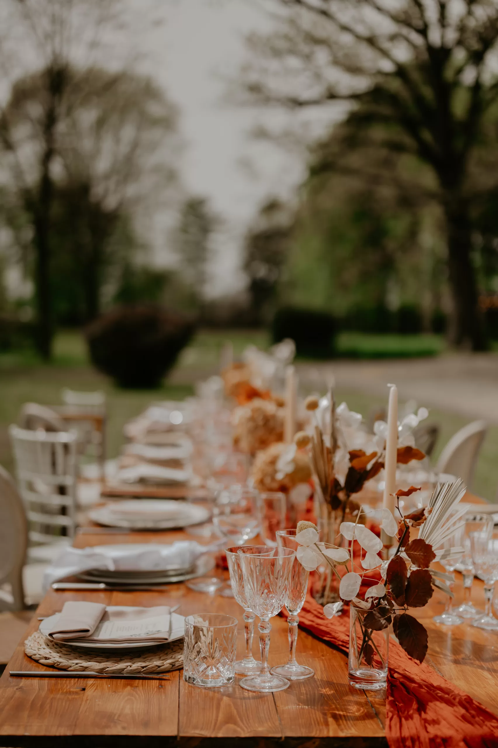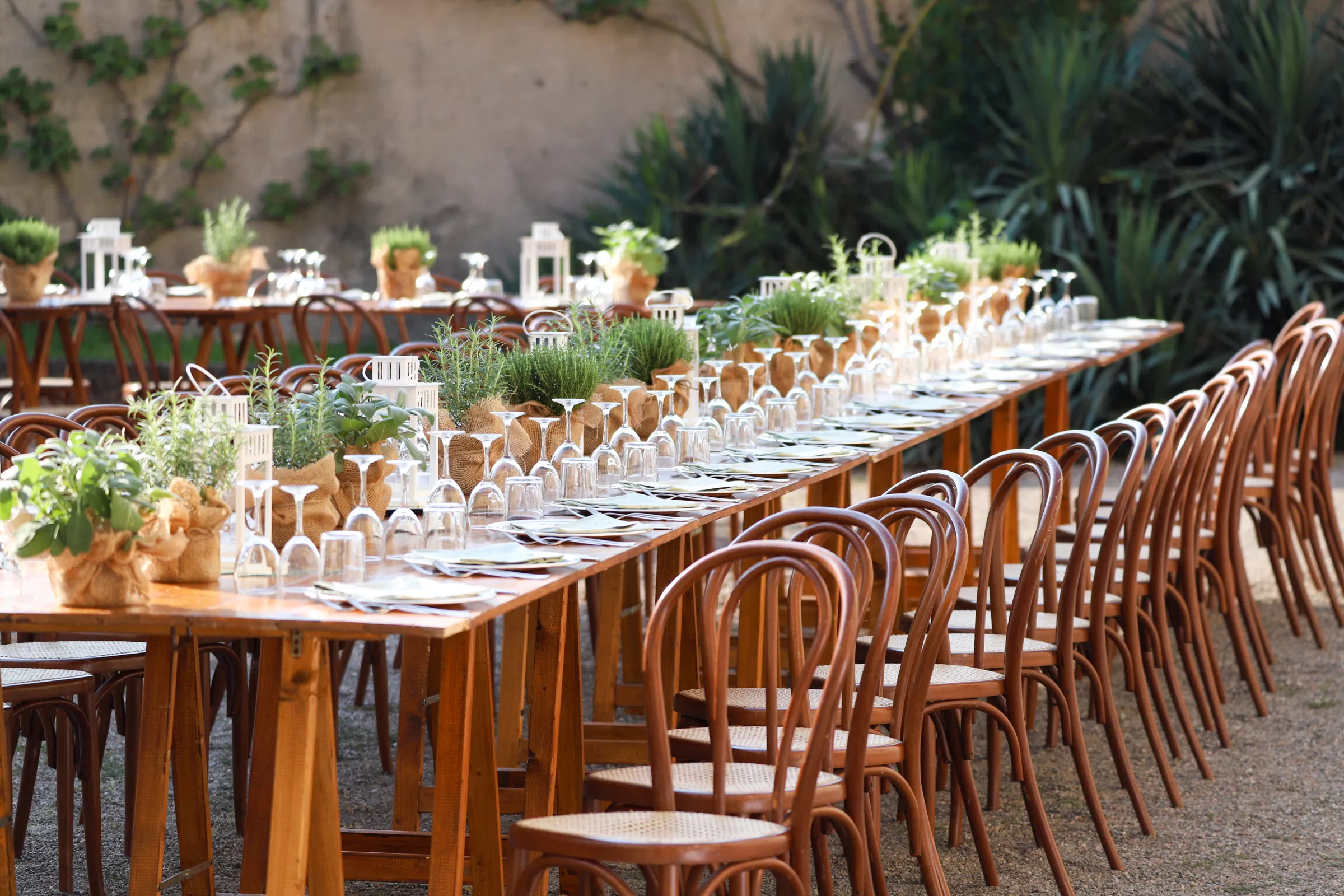 Tavolo rettangolare rustico in legno di noce chiaro, ideale per un allestimento senza tovagliato.